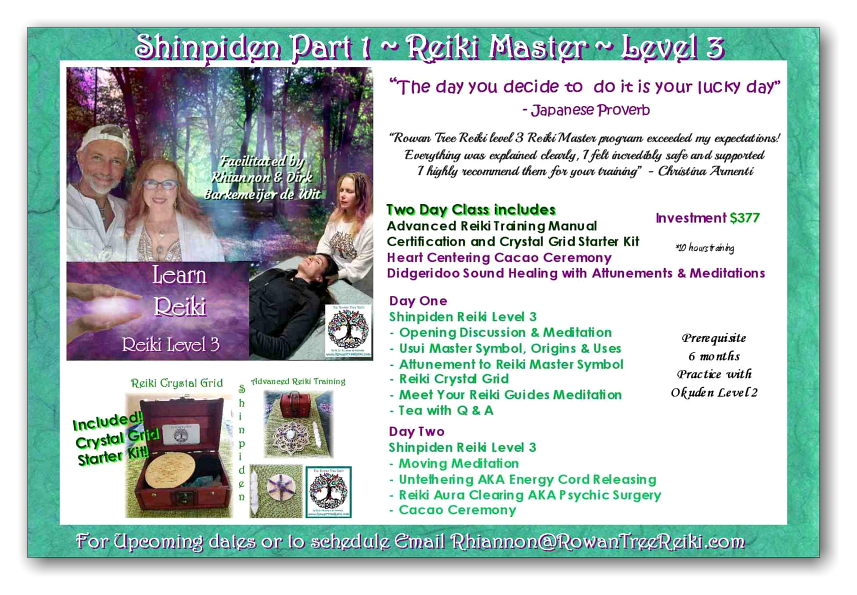 California. Rhiannon and Dirk are level IV certified Usui Reiki Master Teacher Practitioners, Certified Spiritual Healing Practitioners, producers and proprietors of all guided meditation and